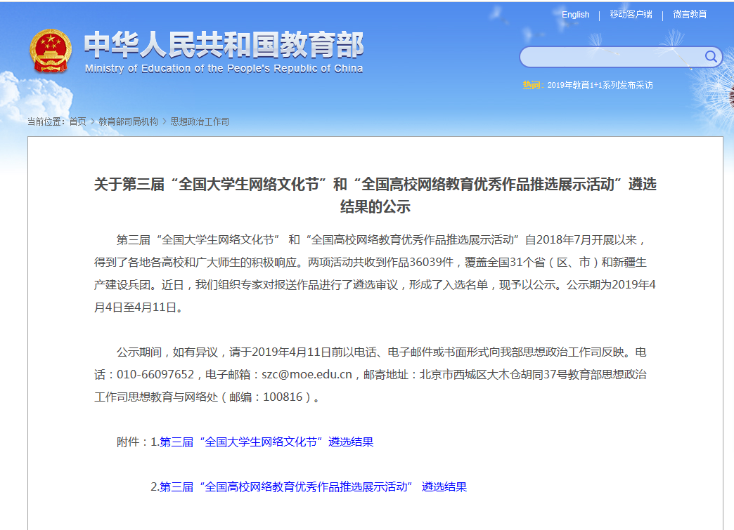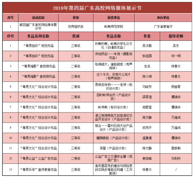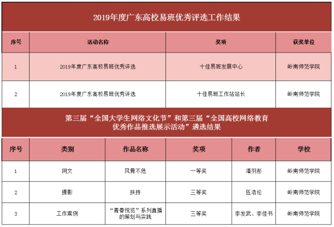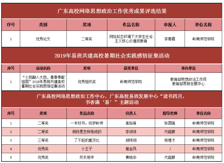在第三届“全国高校网络教育优秀作品推选展示活动”中李发武、李佳书的《“青春悦览”系列直播的策划与实践》荣获三等奖;在广东高校网络思想政治工作优秀成果评选活动中,李春霞的《网络拟态环境下大学生社会主义核心价值观教育》获得优秀论文二等奖;在“第四届广东高校优秀网络文化节”中林春大的工作案例《高校基层党的建设与网络思政实践多维路径构建》荣获三等奖。