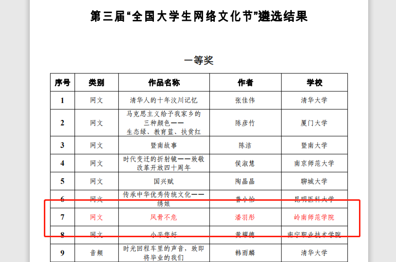 在我校有力的校园文化活动组织中,广大师生创作了一批优秀的网络文化作品。这些网络文化作品在全国、全省获奖的数量大幅增加,从去年的2项作品获奖增长至17项。获奖作品类别也更丰富,从去年仅一类作品获奖增长至五大类别均有作品获奖。作品质量上也有突破性的提升,在教育部举办的第三届“全国大学生网络文化节”活动中潘羽彤的网文作品《风骨不危》拿到了一等奖,与清华大学学生作品比肩。在第四届广东省网络媒体展示节中,我校易班发展中心选送的作品就有13件获奖,学校也荣获优秀组织奖。