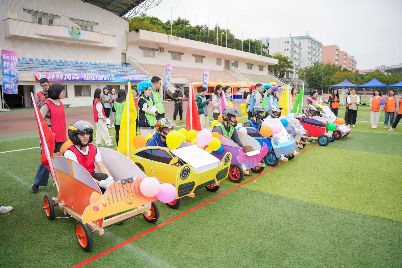 在激动人心的比赛环节中,各小组的成品汽车被投入到了正式的比赛。比赛分为两个赛程:小组合作赛和个人战。在小组合作赛中,两名成员在前面拉车提供动力,用时最少完成一个来回的小组获得胜利。而在个人战中,每组选择一名骑手,由骑手在车中蹬地行走提供动力,优先完成一个来回者获胜。比赛现场气氛紧张而热烈,辅导员们全力以赴,欢呼声加油声不断。