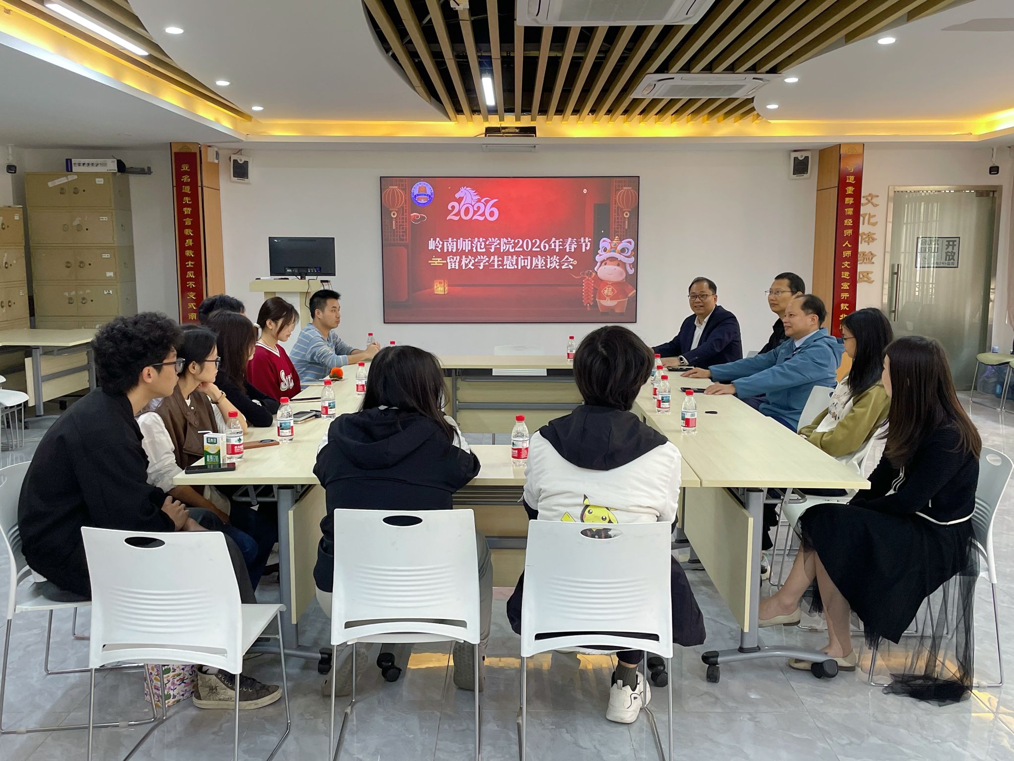 岁律更新,春满校园。2月14日上午,学生处林志军处长、谢伟副处长,化学化工学院李凤炼副书记以及部分学院辅导员代表与留校学子围坐畅谈、共话新春,送上新春红包、慰问品等“年味礼包”,让寒冬校园洋溢着浓浓的年味儿与温情。“同学们春节不返乡,学校就是你们最坚实的后盾,更是温暖的家!”座谈现场暖意融融、氛围热烈。