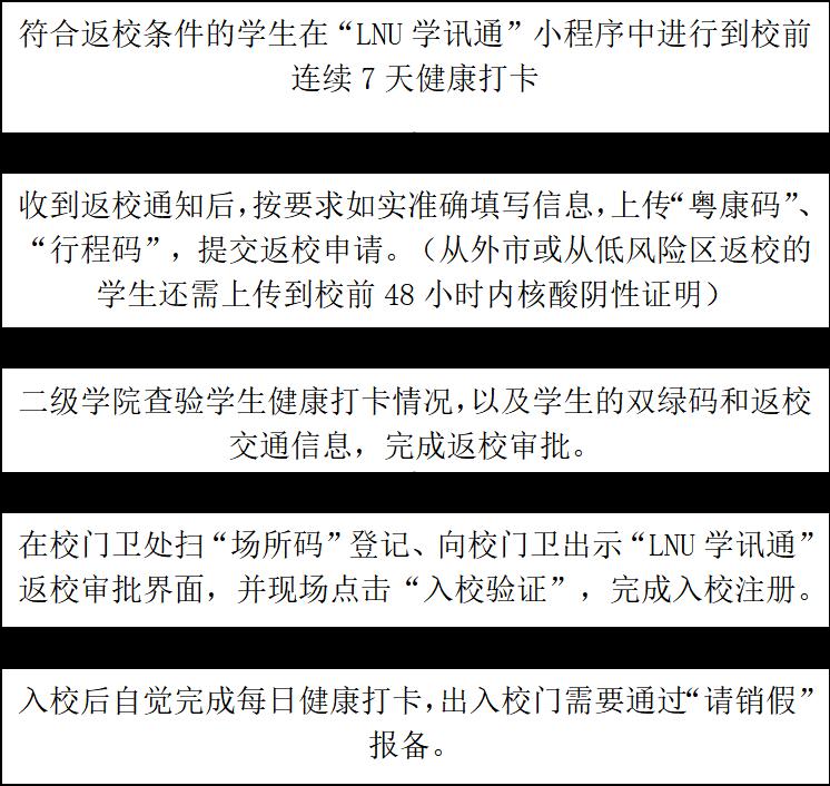 1.按要求有序入校。获批准返校学生按照学校相关规定及返校批次和时间安排有序返校报到,除住博雅苑学生从东门入校外,其余学生从南门入校。在校门卫处扫“场所码”登记、接受体温检测,向校门卫出示“LNU学讯通”返校审批界面,并现场点击蓝底白字的“入校验证”入校。有发热现象须立即到指定地点健康观察或就医,及时逐级上报,不得入住宿舍;因疫情防控需要,返校学生陪送家人及车辆一律不得入校;出租车、网约车一律不得入校。