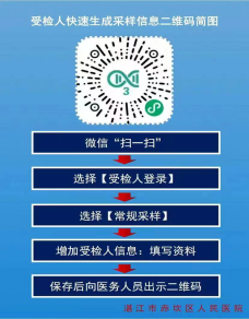 2.请各学院通知所有参检学生更换核酸码,方法:微信扫描“粤核酸3”二维码→受检人登录→常规采样→检测申请→填写受检人信息→分类(应检尽检(凭相关证明免费))→类别选择“20定期抽样检测人员”。