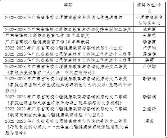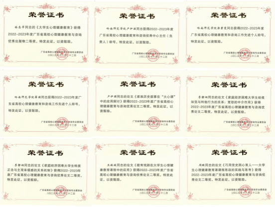 大会表彰了2022-2023年度在高校学生心理健康教育与咨询工作中做出突出贡献的先进集体和先进个人。经过组委会专家严格评选,我校获得荣誉合计12项,具体获奖情况如下: