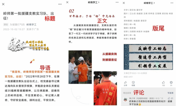 当我们以叙事的视角切入公众号的探讨时,也就意味着不可避免地进入对叙事符码的探讨与研究。在思政类公众号推送中,叙事符码所包含文字内容与图像讯息,共同构成语图关系并直接作用于携带思政育人话语规则与意义规则的叙事系统。网络思政话语的表述力,关键在于语图关系的深层建构机制,毕竟语图关系是将看似零散无序的育人资源以特定的逻辑组织起来的重要桥梁,目的是锚定培养担当民族复兴大任时代新人的要求与目标,为网络思政育人探索精准的解码路径,寻找能凝聚大学生思想共识的认知框架,引导大学生厚植爱国情怀、强化政治认同。当表述力受到压制或冲击时,其暴露的恰恰是语图关系走向失效的困境。