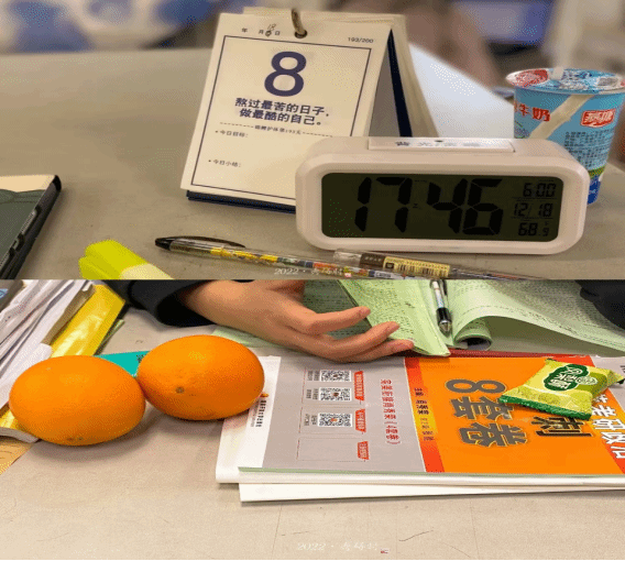 《最后三天!一战成硕!》推文里的两张图像,牛奶和橙子作为食物符号被清晰地建构于图书馆的自习场所。在图书馆管理条例的规训语境中,食物符号并不被赋予合法性,这一合法性要求又是学生群体公众话语的抗争焦点,学生普遍认为不允许带食物进图书馆是“一刀切”的非人性化管理。为了让食物符号在图书馆视域中显得合法化,语图关系挪用了与食物符号相关性较强的符码资源来与之组合并进行阐释,由此我们可以看到,日历、闹钟与牛奶共同搭建的图像被传递出“光阴寸金”的意味,带给学生“在宝贵的时光里,要让日子活色生香”的希望与力量。而橙子与考研政治复习资料的封面形成色调偶合,语言让图像的食物符号与政治符号的结合,解构了食物符号的本意功能,为符码增添了政治考量——橙子与橙色的考研政治资料,是一次休闲话语与奋进话语的相遇,是公众话语与官方话语的合流,是鲜活的青年诉求与严肃的思政诉求的圆融。由此可见,语图关系通过收编资源、让资源合法化,缝合了官方话语与公众话语的裂痕,让网络思政话语更亲民、更具感染力和影响力。