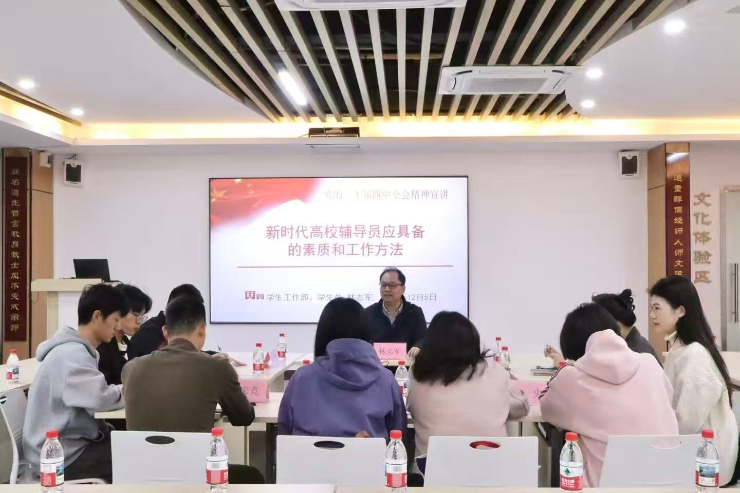 12月5日,我校学生处在“一站式”服务大厅开展举行深入学习贯彻党的二十届四中全会精神宣讲报告会,学生处处长林志军以“中国式现代化进程中高校辅导员应具备的素质和工作方法”为题开展宣讲。全体新入职辅导员参加会议。