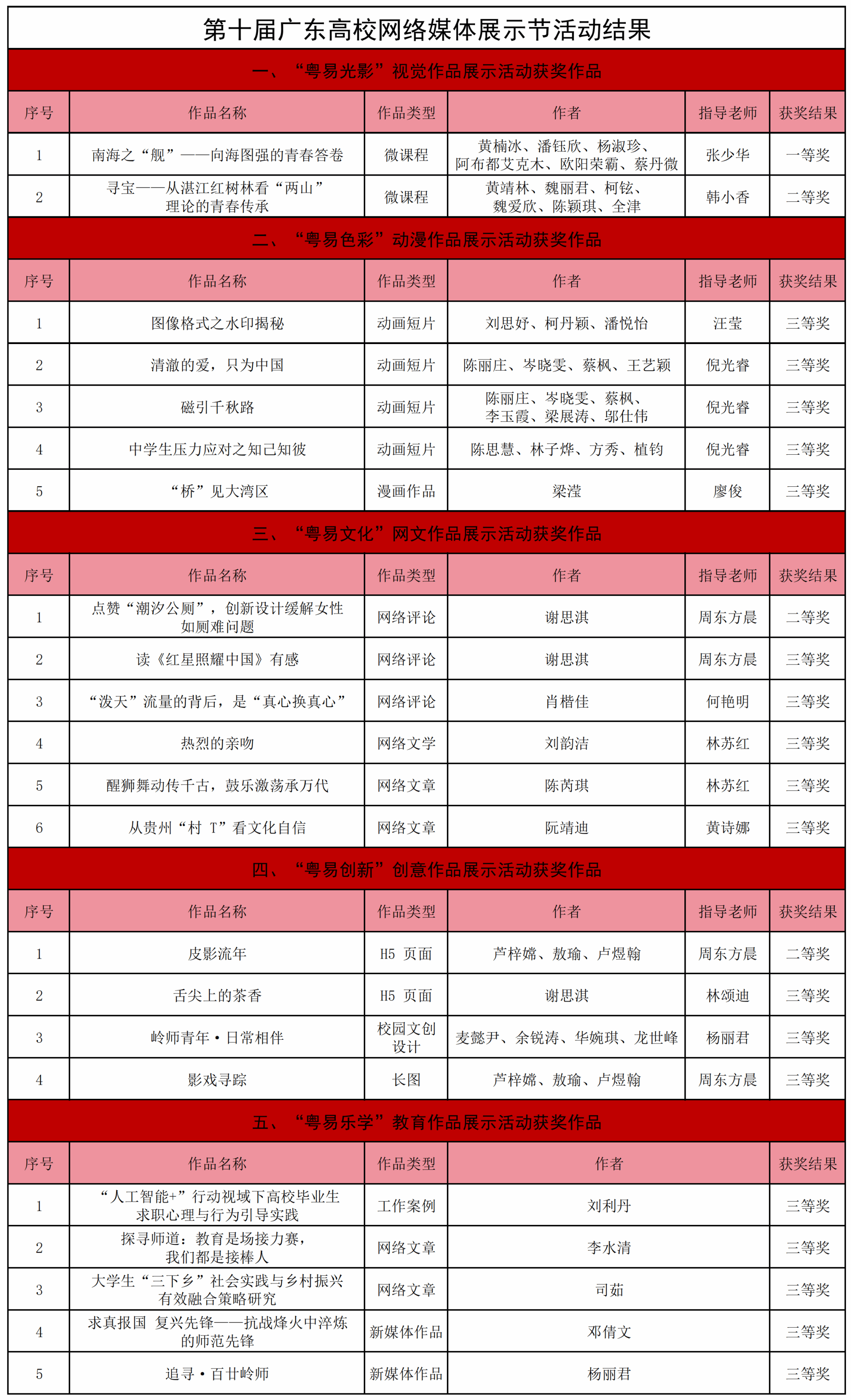 近日,第十届广东高校网络媒体展示节活动结果公布。我校送选作品表现亮眼,共有22项斩获佳绩,与历史最高获奖数持平。其中一等奖1项、二等奖3项、三等奖18项;同时,我校连续四年获评“优秀组织奖”。